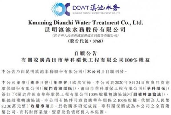 9月24日,滇池水務(wù)宣布,公司與廈門嵩湖環(huán)保股份有限公司、莆田市華科環(huán)保工程有限公司(以下簡稱華科環(huán)保)簽訂協(xié)議,收購華科環(huán)保100%股權(quán),代價(jià)為人民幣8130萬元,交易各方已簽訂股權(quán)轉(zhuǎn)讓協(xié)議。本文轉(zhuǎn)載于網(wǎng)絡(luò),如涉及版權(quán)問題請發(fā)現(xiàn)及時(shí)聯(lián)系,我們定會(huì)配合刪除;我公司專業(yè)生產(chǎn)一體化預(yù)制泵站,磁力泵,塑料泵,離心泵,排污泵,潛水泵,化工泵,油泵,隔膜泵等。