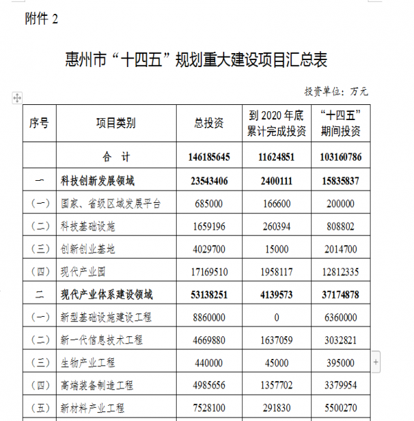 6月3日,惠州市政府正式對外公布《惠州市國民經(jīng)濟(jì)和社會發(fā)展第十四個五年規(guī)劃和2035年遠(yuǎn)景目標(biāo)綱要》(下稱《綱要》)。其中明確提出,“十四五”期間規(guī)劃建設(shè)重大項目312宗,計劃總投資近1.5萬億元,“十四五”期間計劃投資10316億元。