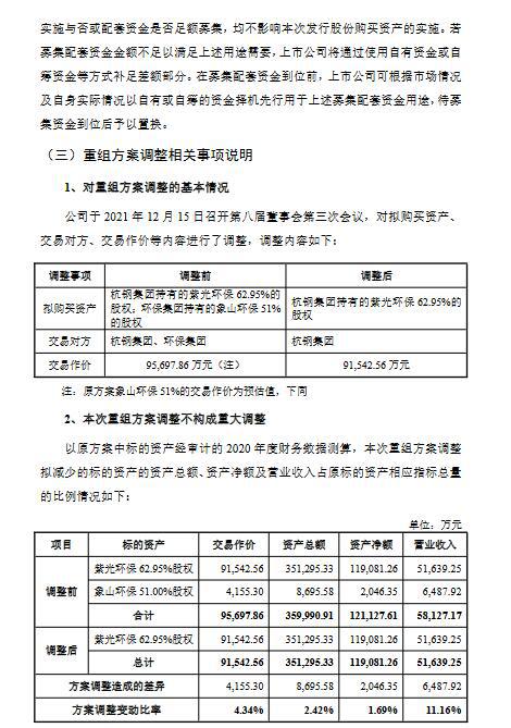 綜合考慮象山環(huán)保的項(xiàng)目運(yùn)營(yíng)情況、盈利能力及其對(duì)于上市公司重組完成后盈利能力的影響后,上市公司董事會(huì)本著增厚上市公司收益的交易原則,審慎修訂了本次交易標(biāo)的范圍。最終,公司決定調(diào)整本次重組方案,將收購(gòu)的標(biāo)的資產(chǎn)范圍由紫光環(huán)保62.95%股權(quán)和象山環(huán)保51.00%股權(quán)變更為紫光環(huán)保62.95%股權(quán)。